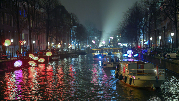The Amsterdam Light Festival is a trail along the canals. People create art made from lights. There are light statues and pictures. Some buildings are lit up to make pictures, too.