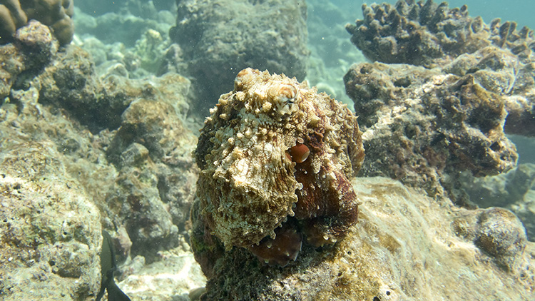 Octopuses can change the texture of their skin. They match the texture of a rock or coral. They have small bumps on their skin that they can make larger or smaller to help blend in.