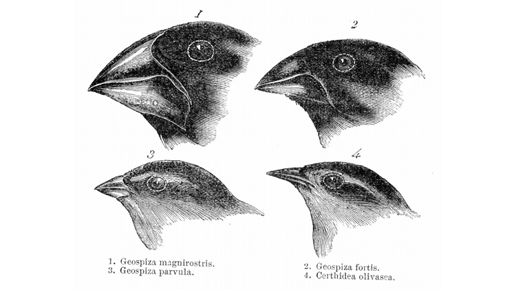 Darwin also noticed that the finches (group of small songbirds) were different depending on the island. They had beaks of different sizes and shapes. Darwin observed that the finches ate different food. The food they ate was based on the size and shape of their beaks. He wondered about the different environments on each island. He asked questions. He wanted to know if the environments affected shell shape in the tortoises. Did the environment affect beak shape in the finches?