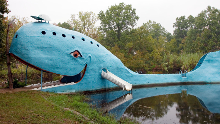 This is the Blue Whale. It is in Catoosa, Oklahoma. Travelers stop along Route 66 to see it. They take its picture. Some people even go inside its mouth. Would you dare?