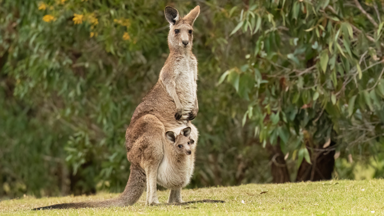 A las crías de canguro las llaman joeys, en inglés. Las canguros hembra tienen una bolsa en la parte delantera. Mantienen a sus crías en la bolsa mientras crecen. Los joeys suelen salir de la bolsa al cumplir unos 10 meses de edad.